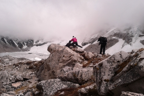 What’s surprising about Everest Base Camp is the color. It’s a flinty, gray place littered with shards of Himalayan sandstone and shale. Here and there appears a vivid green pool of alpine water. And then there’s the red, blue and green prayer flags hung by Himalayans to blow blessings in the wind.