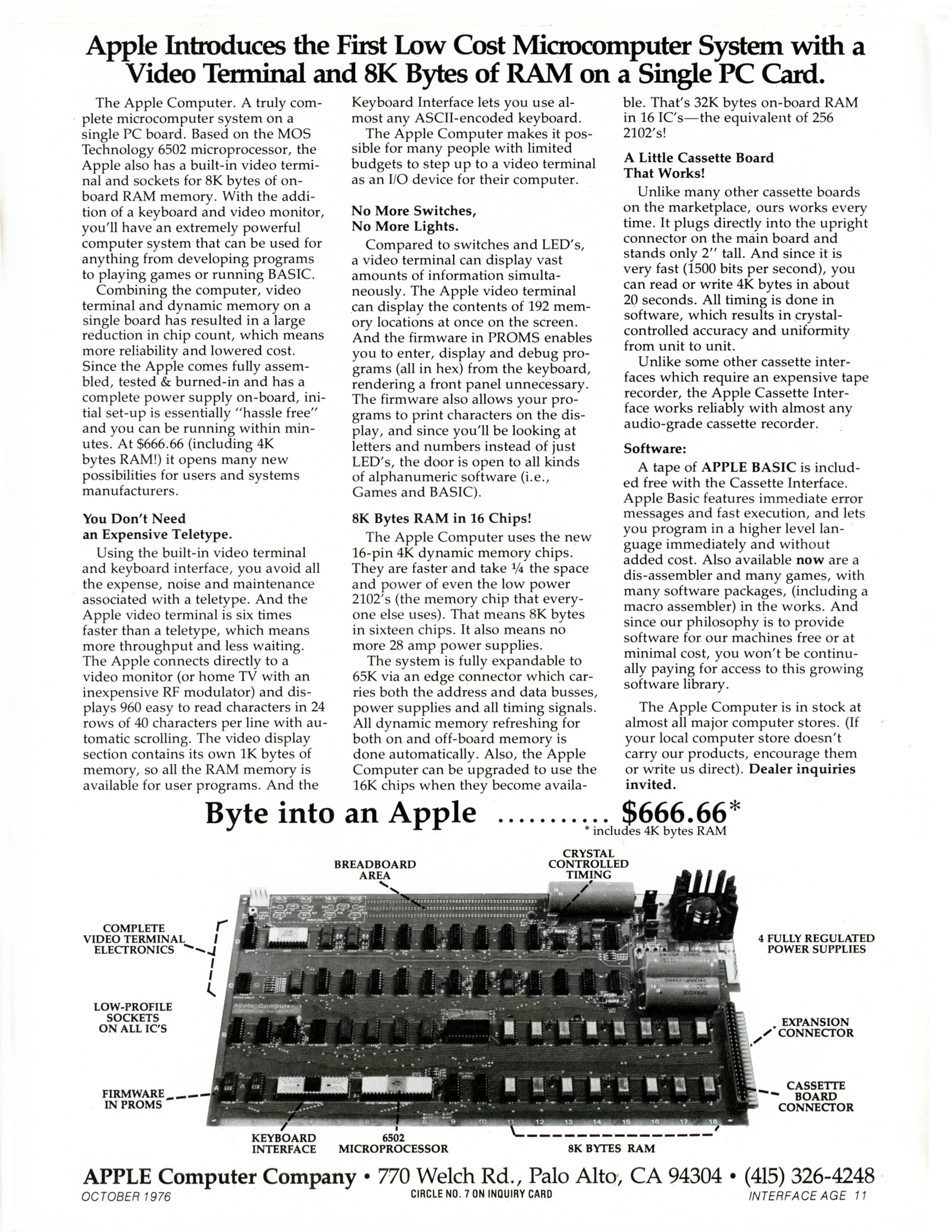 When I bought the MacBook on which I’m writing this post, I simply opened it up and, naturally, found it ready to use. That would scarcely have been imaginable to computer enthusiasts of the mid-seventies, accustomed as they were to soldering individually purchased chips onto electronics boards by hand. The Apple I marked a great leap forward in convenience by coming already assembled, albeit without a monitor, a keyboard, or even a case; the purchase price of USD $666.66 (closer to $4,000 today) just got you the board. But what a board.