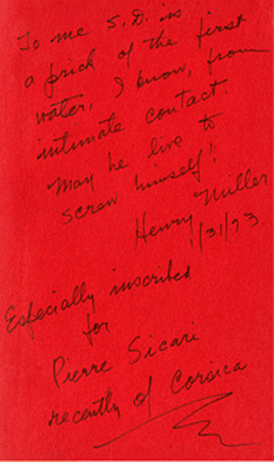 There’s no two ways about it. Hen­ry Miller had a way with words. He could be blunt, lewd, cut­ting, all in one short sen­tence. You want a lit­tle case study? Ok, how about the notes Miller scrawled back in 1973, when he called Sal­vador Dalí “the biggest ‘prick” of the 20th cen­tu­ry” (or, in anoth­er instance a “prick of the first water”). What was his beef with the Span­ish sur­re­al­ist? It all start­ed in 1940, when Miller and his lover, the incom­pa­ra­ble Anaïs Nin, spent some time cooped up in the same house with Dalí, who turned out to be an insuf­fer­able pri­ma don­na. Their time togeth­er end­ed in a wild shout­ing match, with Miller and Nin storm­ing out of the home and hold­ing a grudge for decades to come. The sto­ry is nice­ly recount­ed by Book Tryst, a site that has recent­ly become a new favorite of ours.